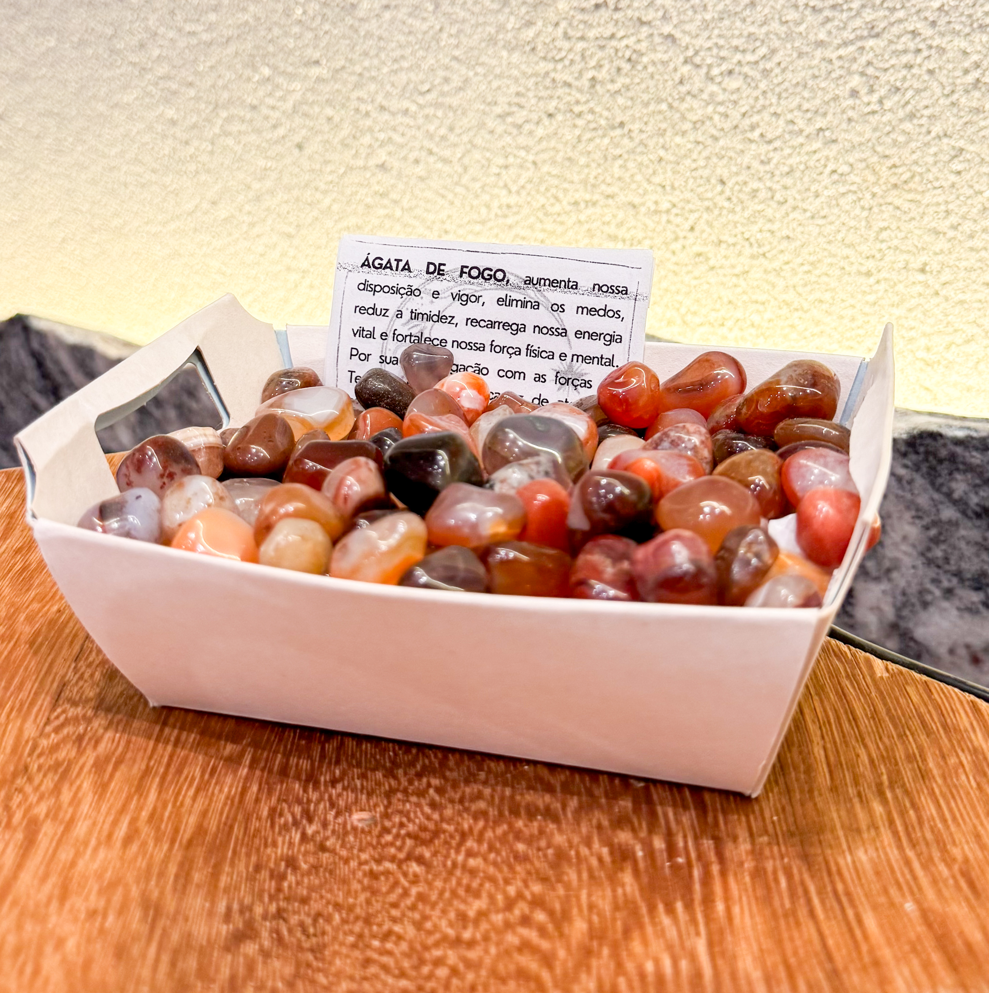 A Ágata de Fogo é um cristal de energia intensa e vitalizante, associado à força, à coragem e ao fortalecimento interior. Ela aumenta a disposição e o vigor, recarrega a energia vital e auxilia a eliminar medos, reduzir a timidez e fortalecer tanto a força física quanto a mental.