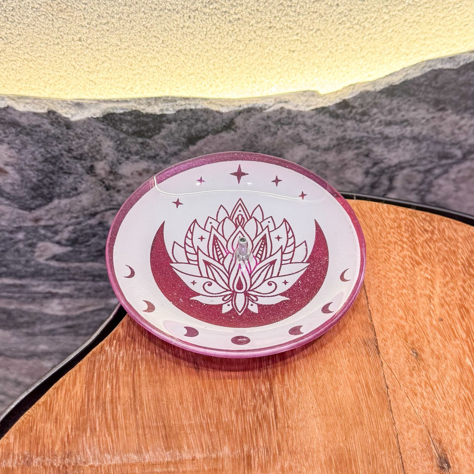 Este incensário em vidro serigrafado, na suave tonalidade rosa com glitter, traz leveza, beleza e uma energia de amor, delicadeza e autocuidado. Ideal para meditações, rituais de equilíbrio emocional, momentos de relaxamento e conexão interior.