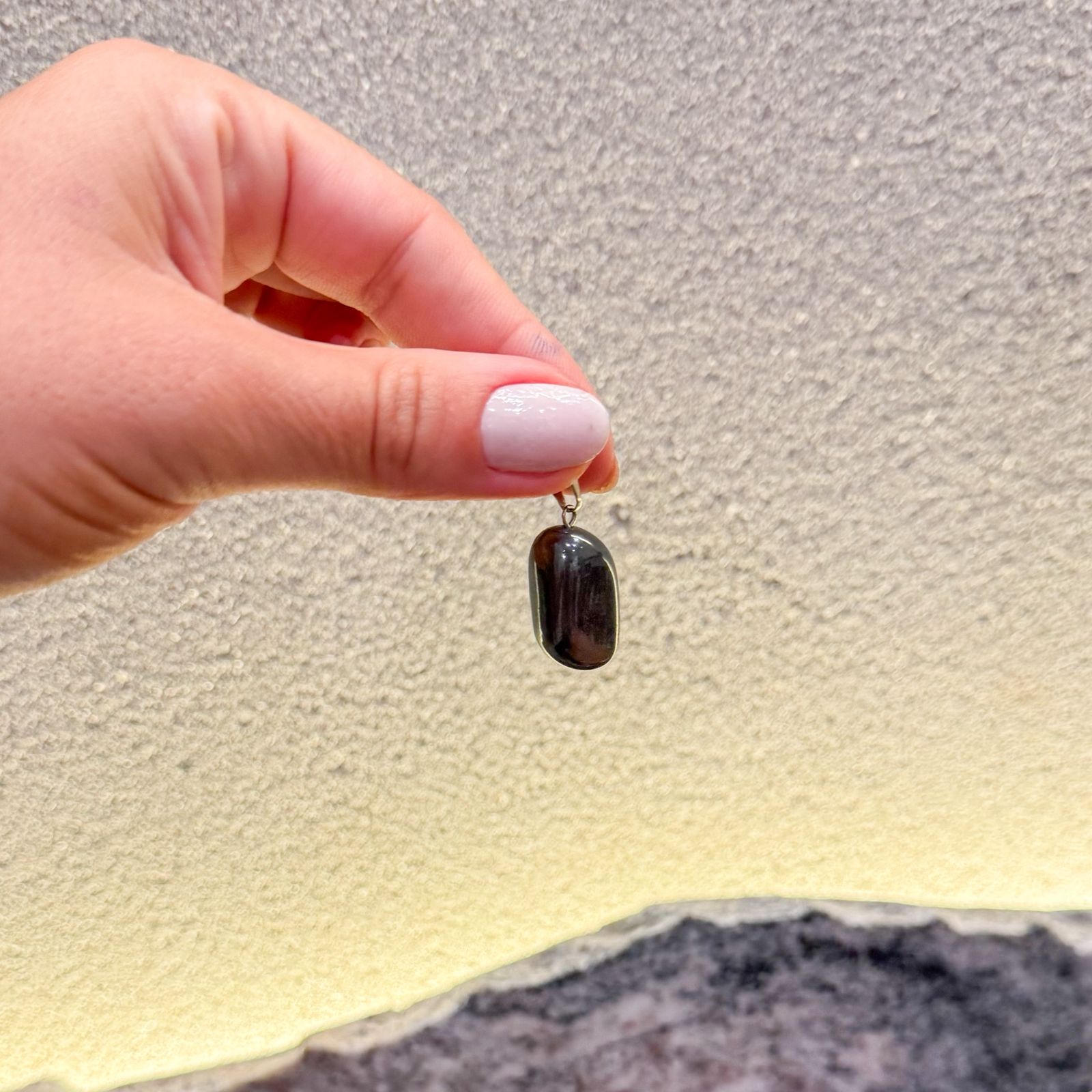 Pingente em pedra rolada de Hematita, possui formato irregular e único, com tamanho médio aproximado de 1,5 cm, com detalhes em latão.