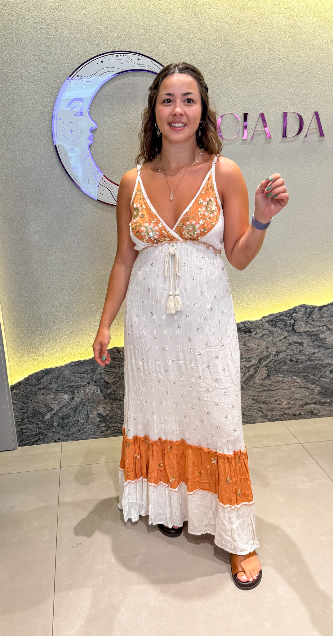 Com inspiração boho chic, este Vestido Indiano Longo une elegância, leveza e detalhes que encantam. Os bordados a mão dourados trazem um toque de sofisticação, enquanto o decote em V valoriza a silhueta com delicadeza.