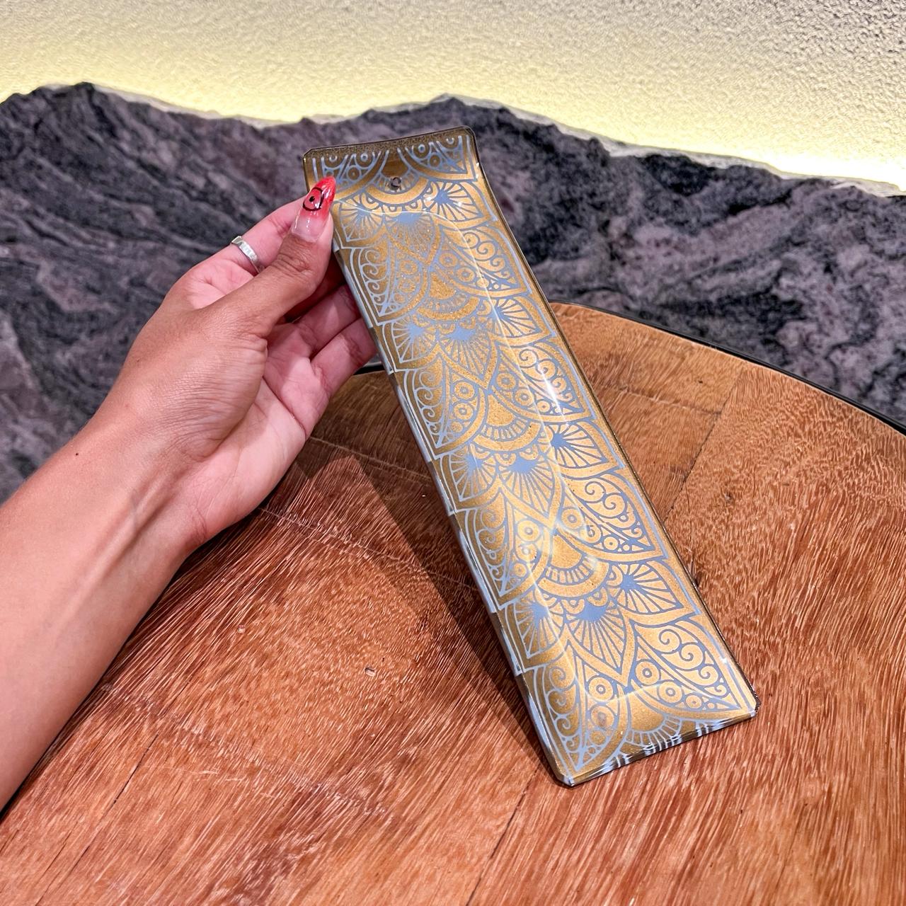 Seu formato alongado foi pensado para acomodar a vareta de incenso com segurança, permitindo que as cinzas sejam depositadas ao longo da base, mantendo o espaço limpo e organizado durante o uso.