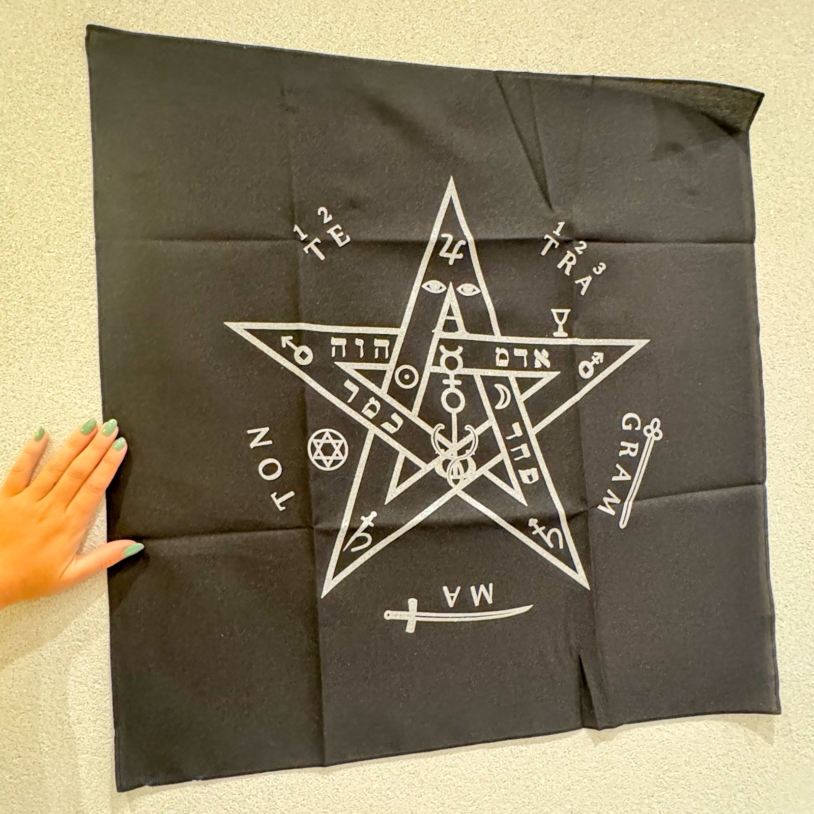 Toalha ideal para mesa de tarô, oráculos e práticas espirituais, trazendo o poderoso símbolo do Tetragrammaton, associado à proteção, autoridade espiritual e equilíbrio entre os elementos.