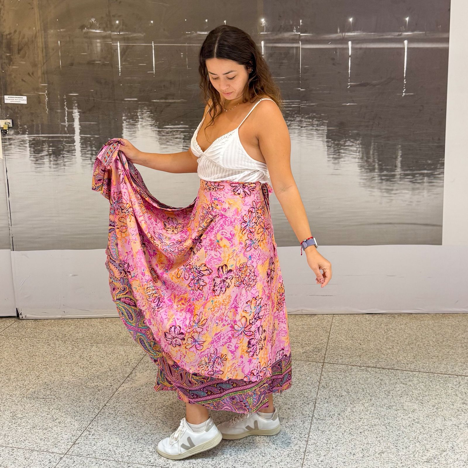 Em tamanho único, permite diversas formas de amarração, transformando-se facilmente em saia, vestido ou outras possibilidades criativas. Em nosso Instagram, você encontra ideias de amarrações e inspirações para explorar toda a beleza e versatilidade dessa peça.