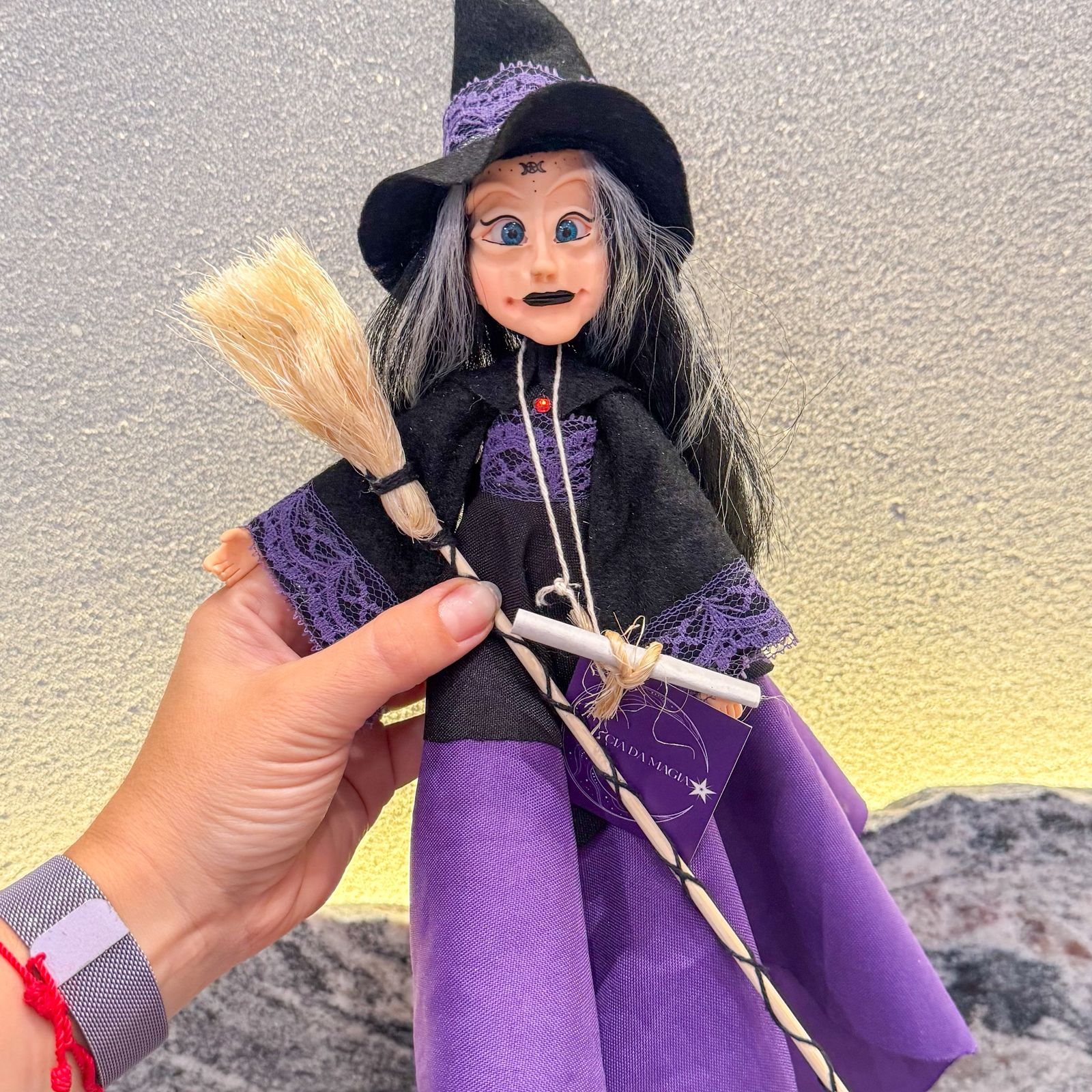 Cada bruxa é produzida artesanalmente em biscuit e tecido, com acabamento manual, o que torna cada peça única.