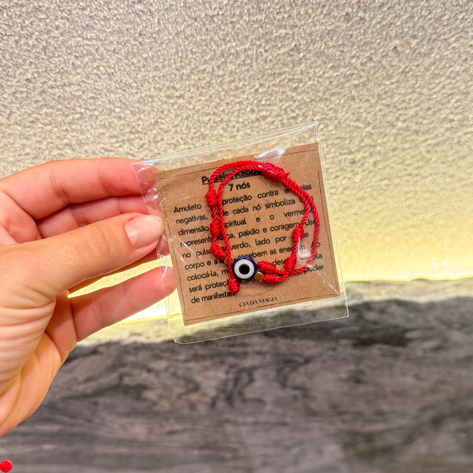 Amuleto de proteção energética, onde cada nó representa uma dimensão espiritual e a cor vermelha simboliza força, coragem e vitalidade. O pingente de Olho Grego potencializa a proteção contra inveja, mau-olhado e energias negativas. Usada no pulso esquerdo, cria uma barreira de proteção espiritual e auxilia na manifestação de intenções e desejos. Ideal para quem busca proteção, equilíbrio e conexão energética. ✨